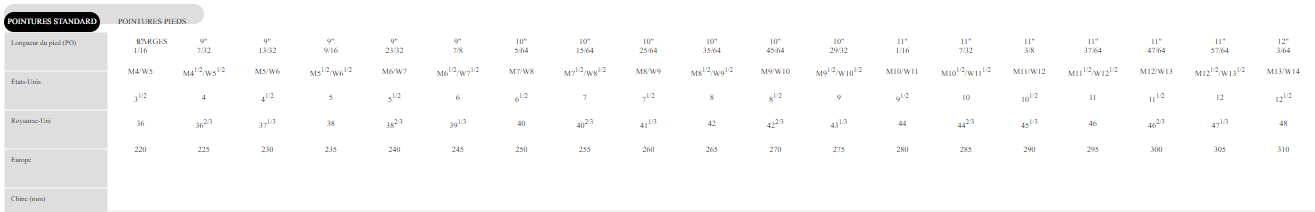 Pour connaitre sa pointure, il suffit de poser le pied nu sur une feuille de papier et de dessiner son contour. Ensuite, il faut prendre la mesure (en cm) entre votre talon et votre bout du pied. Une fois ces mesures prises, vous pouvez trouver la valeur correspondante pour une pointure US ou UK : 22,3 cm = Pointure 35 ect...