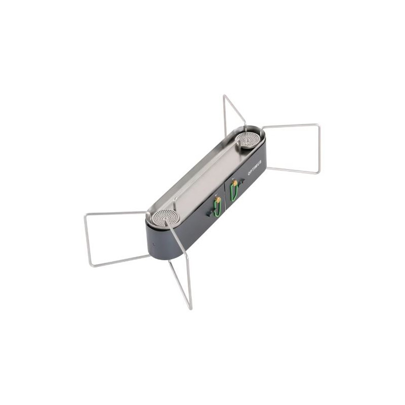 Ce réchaud est très compact, une fois replié, il mesure 385 x 195 x 105 mm, pour un poids de 760 grammes. Déplié, il peut accueillir deux casseroles d’un diamètre allant jusqu’à une vingtaine de centimètres.