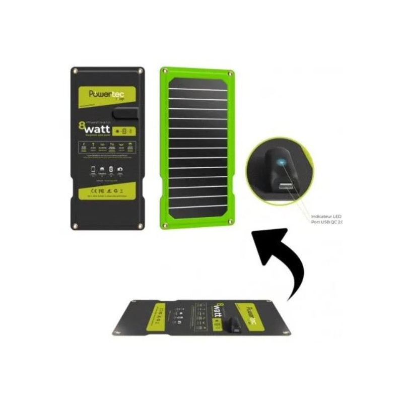 Léger, compact mais puissant, le panneau solaire Powertec PT Flap 8 est capable d’alimenter ou charger en charge rapide grâce à sa puissance de 8 Watts et son port USB QC 2.0 (5 V).